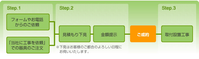 | お約束の日程で実際の工事担当者がお見積もりにお伺いいたします。 |